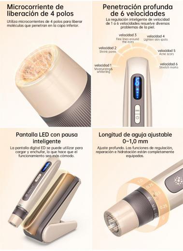 - * 【Velocidad ajustable y profundidad de aguja】Estos dispositivos generalmente ofrecen múltiples niveles de velocidad (por ejemplo, 6 configuraciones) y profundidad de aguja ajustable, generalmente hasta 2,5 mm, para tratamientos personalizados.