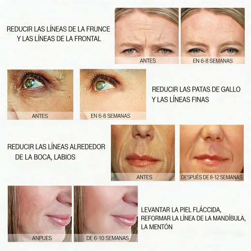 Muchos usuarios informan una mejora inicial en la firmeza y elasticidad de la piel después de solo 2 a 4 semanas. Los resultados más claros, como menos arrugas y contornos faciales más firmes, suelen ser visibles después de 8 a 12 semanas de uso regular.