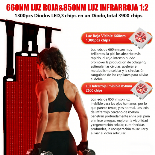 - * 【MÚLTIPLES USOS Y BENEFICIOS】1.660nm: Promueve el crecimiento de colágeno, la regeneración de elastina y la respiración aeróbica en la dermis. 2.850nm: Promueve la circulación sanguínea, mejora el metabolismo, acelera la cicatrización de heridas y mejora la inmunidad corporal. 3. Alivio del dolor: Alivia la fatiga y el dolor de la columna lumbar, alivia el dolor corporal y articular, relaja el cuerpo y la mente. 4. Piel tierna: Absorbida por la piel, lo que aumenta la producción de colágeno y promueve la salud de la piel. 5. Recuperación posparto: Desvanece las estrías gravídicas y restaura la figura perfecta. 6. Material suave y agradable para la piel: La manta de terapia infrarroja roja es su mejor opción de regalo. 7. Escenario de aplicación: Hogar, salón de belleza, oficina, etc.