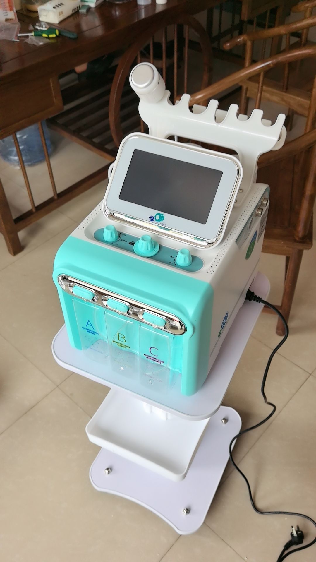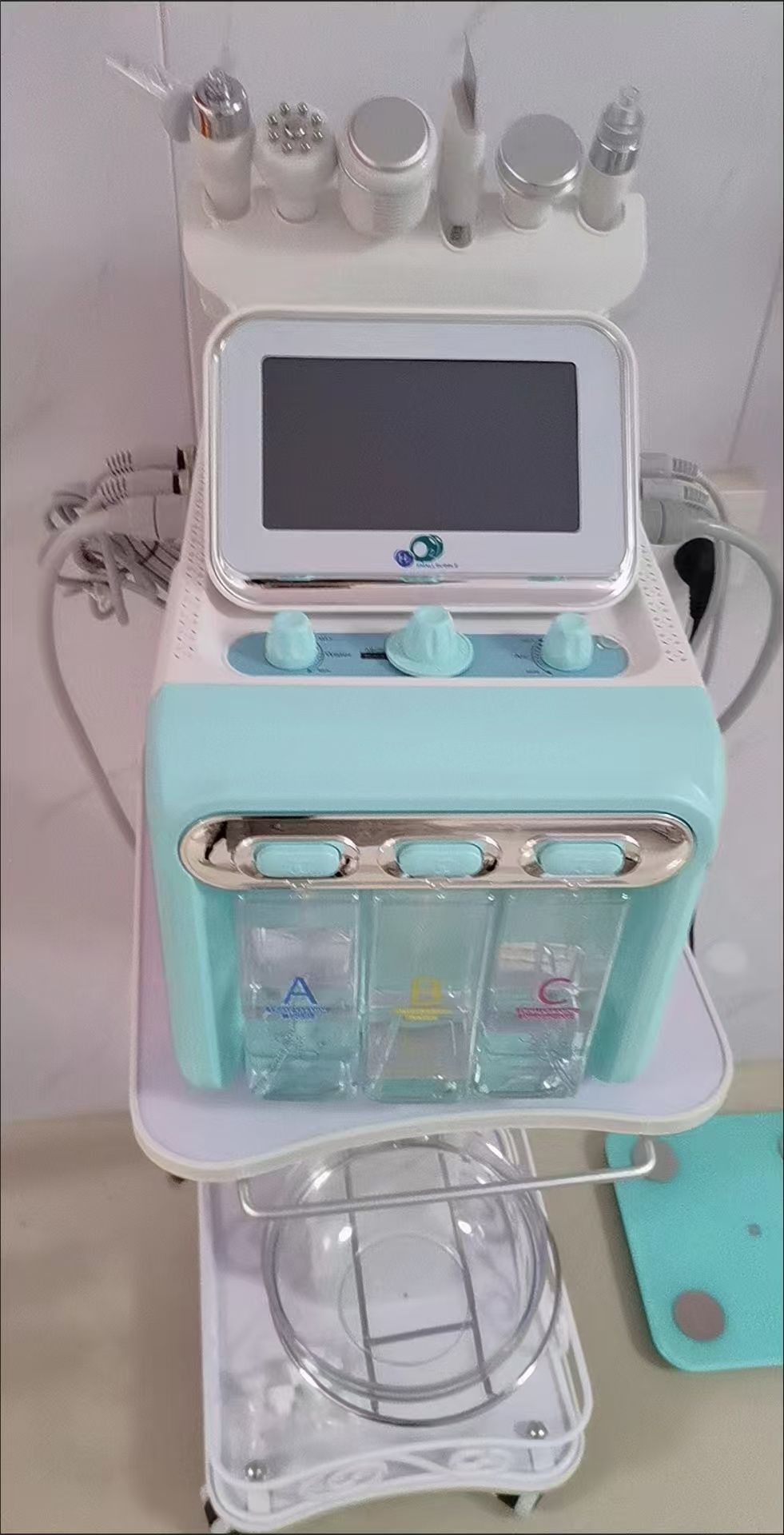 Dispositivo profesional seis en uno para el rejuvenecimiento facial hidratante, que integra microdermoabrasión, lifting biofacial, hidratación y infusión de hidrooxígeno, diseñado específicamente para el cuidado de la piel y los tratamientos de belleza.